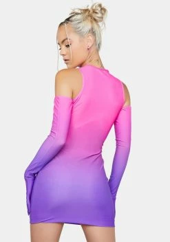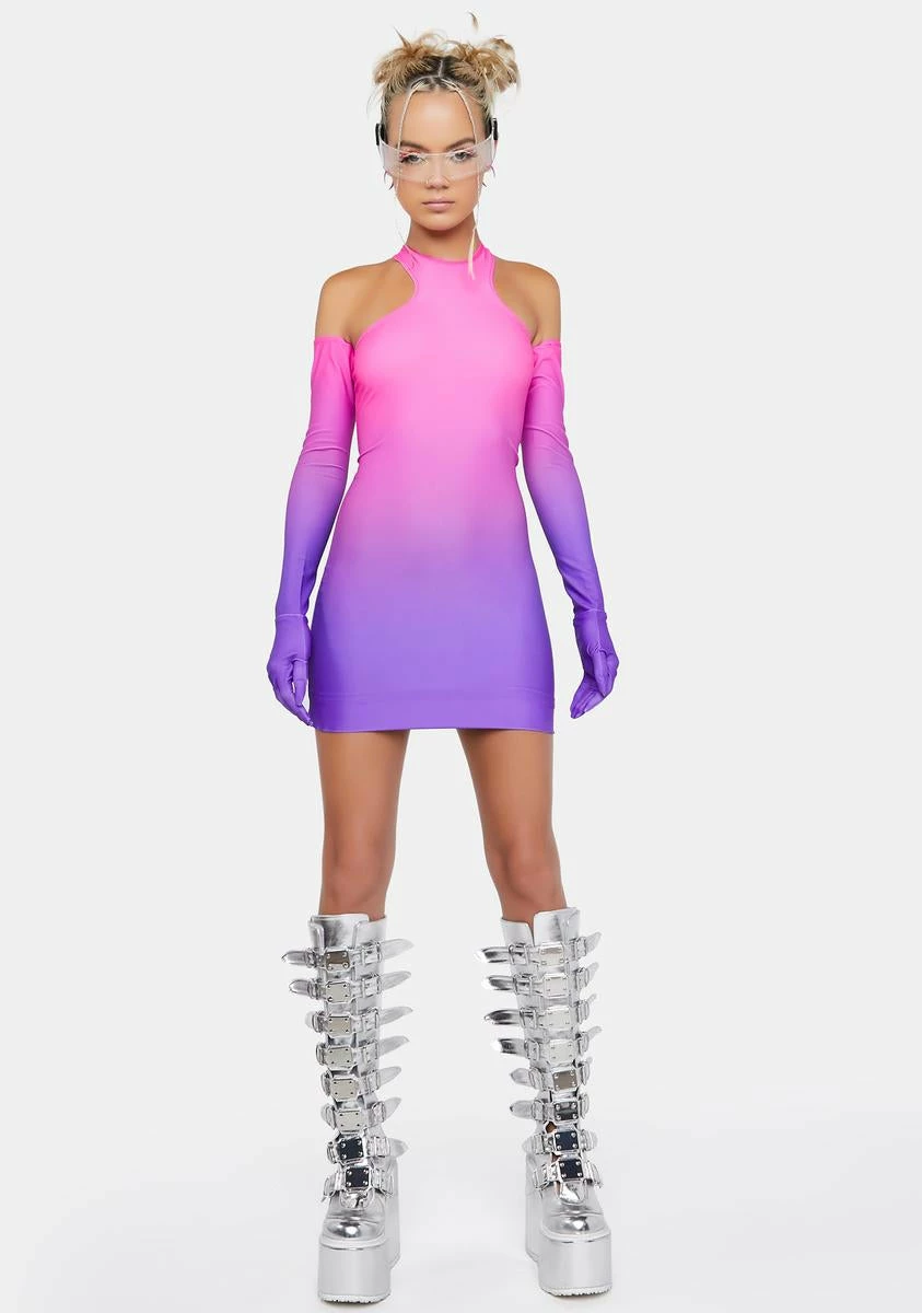 that’s when the party starts. This mini dress comes in a stretch construction, racerback fit, ombre print, with matching gloves.