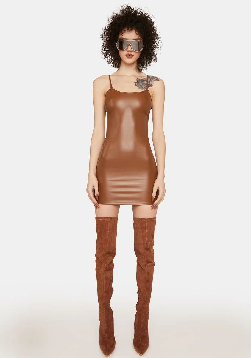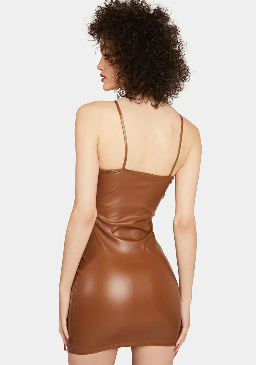 cuz what a feeling! Feel the rhythm in this mini dress that has a vegan leather construction, spaghetti straps, and a bodycon fit.