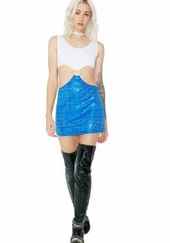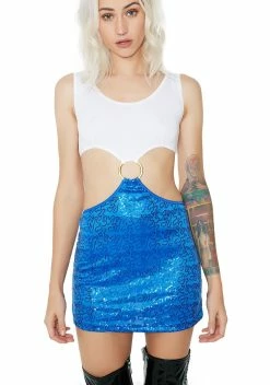 youâre just a pretty woman lookinâ for her sugar daddy. This mini dress is white on the top and shimmery blue on the bottom with O-ring connector at the center.