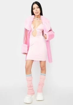 has a plunge neckline, a ruched cutout in front, a strappy open back, and a bodycon fit.