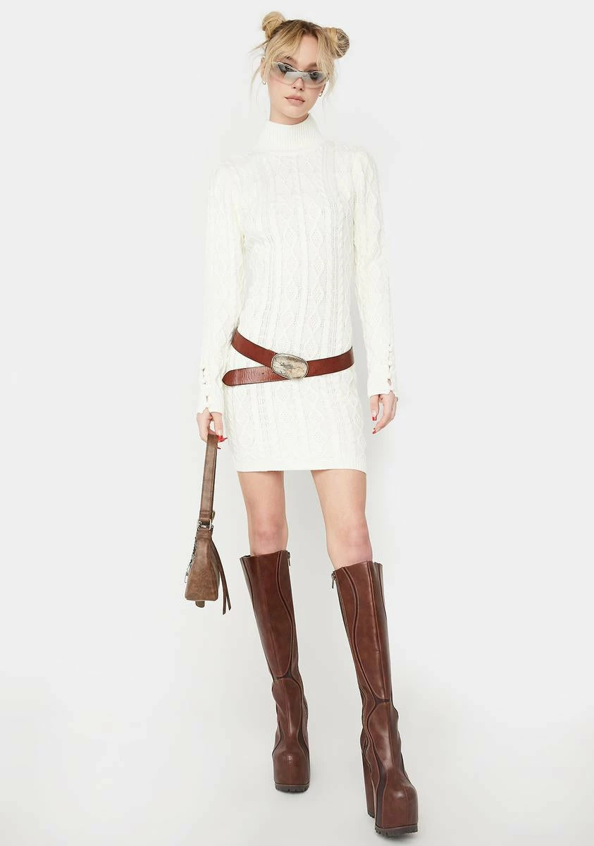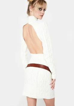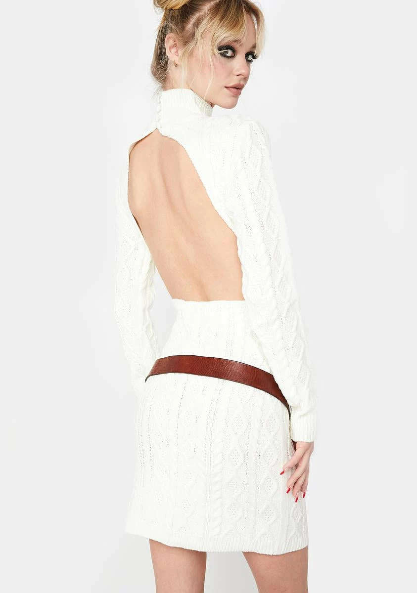 cuz never stay in one place for long. This knit dress has a cable knit construction, a mock neckline, long sleeves with button up detailing, a bodycon fit, an open back, and a button up closure in the back.