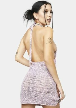 cuz I’ll see ya later. This halter dress has a sheer knit construction, an open back, and a halter neckline with adjustable tie closures.