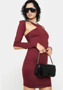 has long sleeves, cutouts at the shoulders, back and elbows, and a bodycon mini fit.