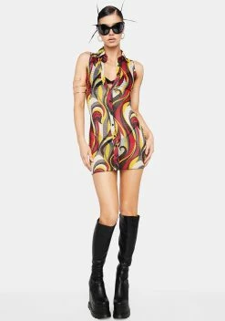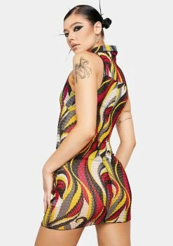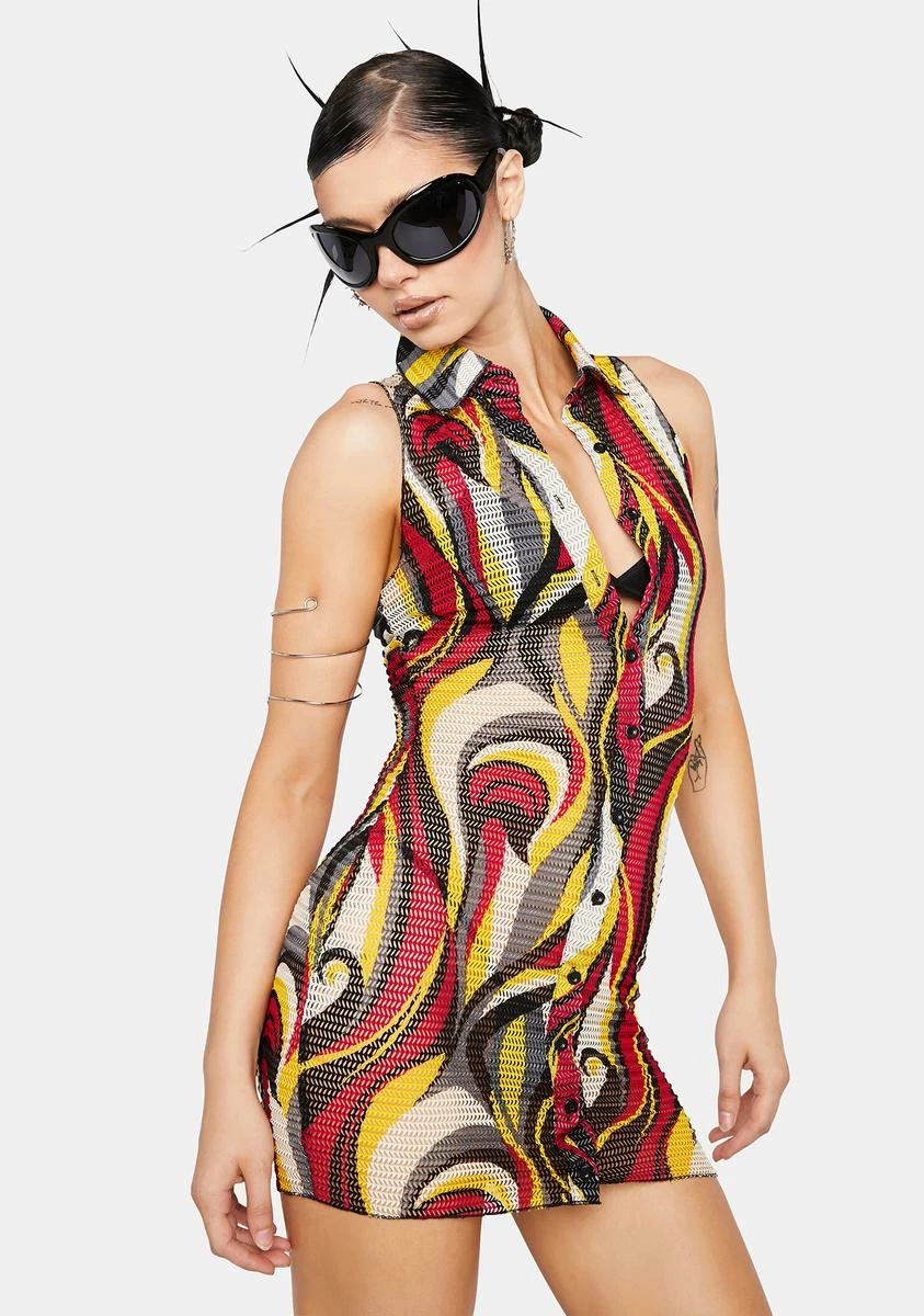 cuz you’re catching some sun! This mini dress has a multi-colored abstract print, a netted construction, a collared neckline, a button closures down the front.