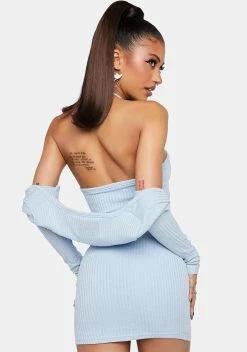 cuz you’re heavenly. This mini dress comes in a ribbed knit construction, with a halter strap, plunging neckline, metal hardware details, and matching shrug.