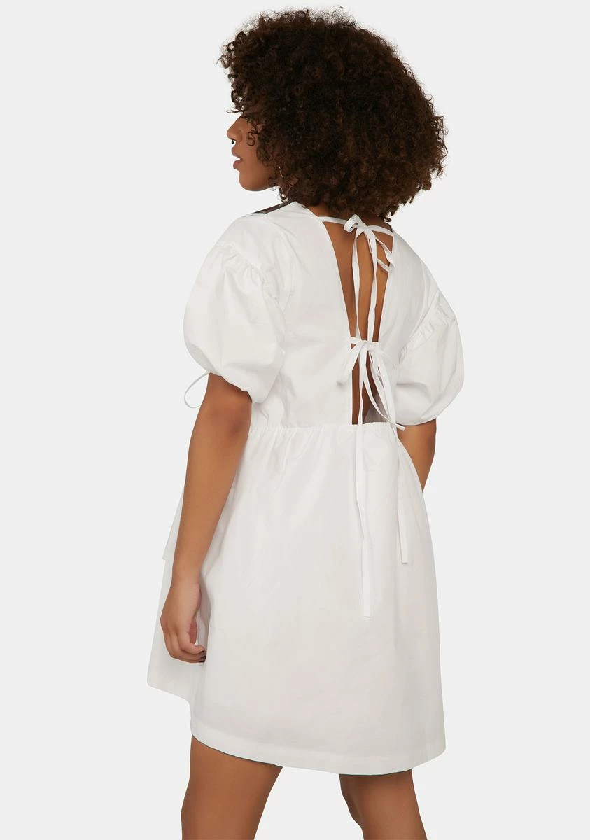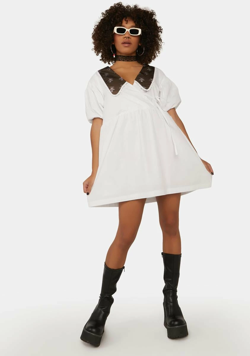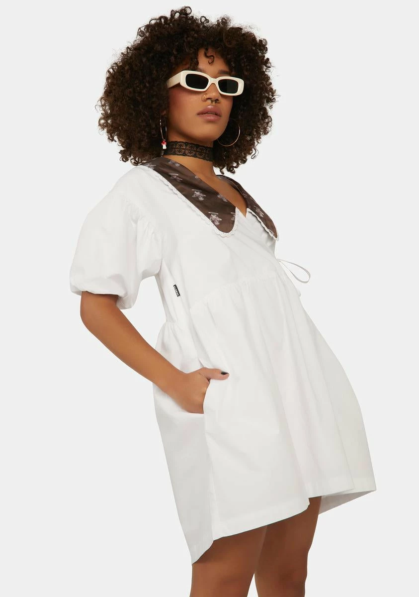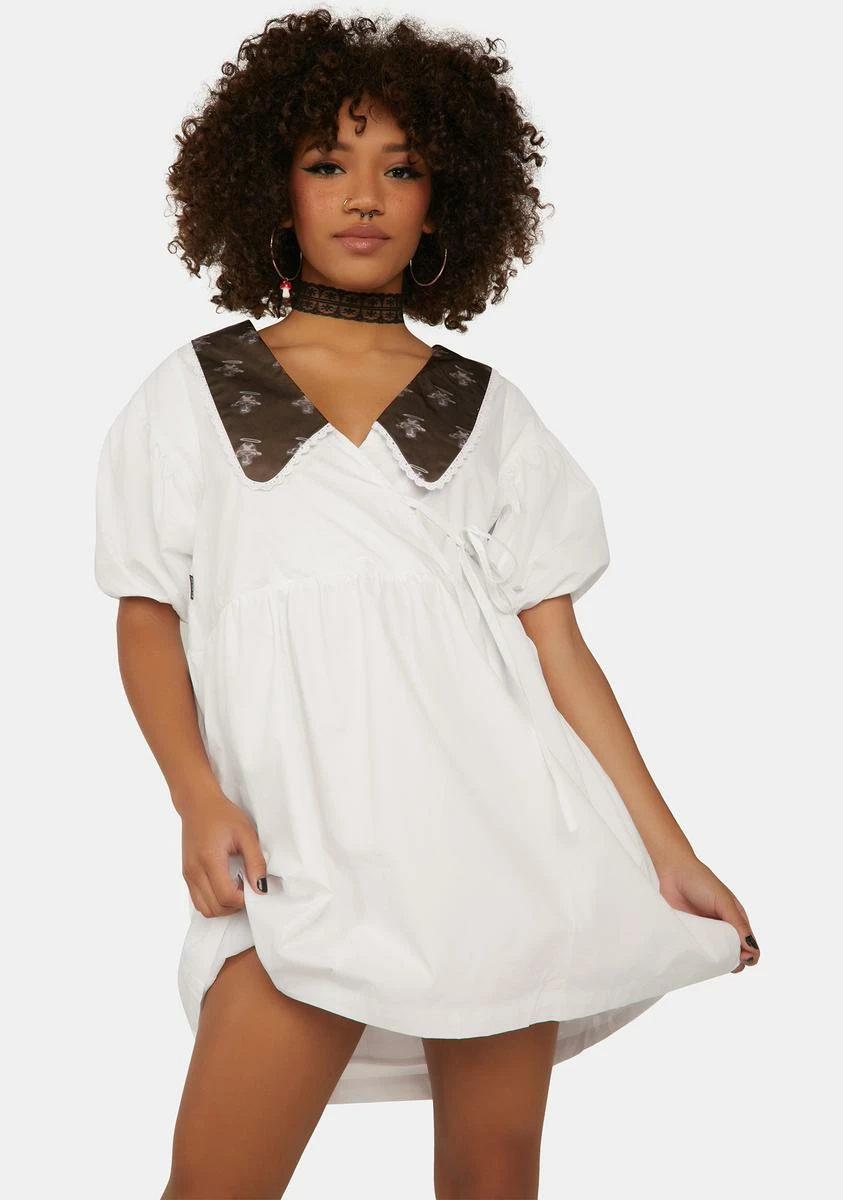 cuz you’re shroom crazy. This mini dress comes with short puff sleeves, front pockets, a contrasting scalloped collar with a mushroom print, and back tie closures.